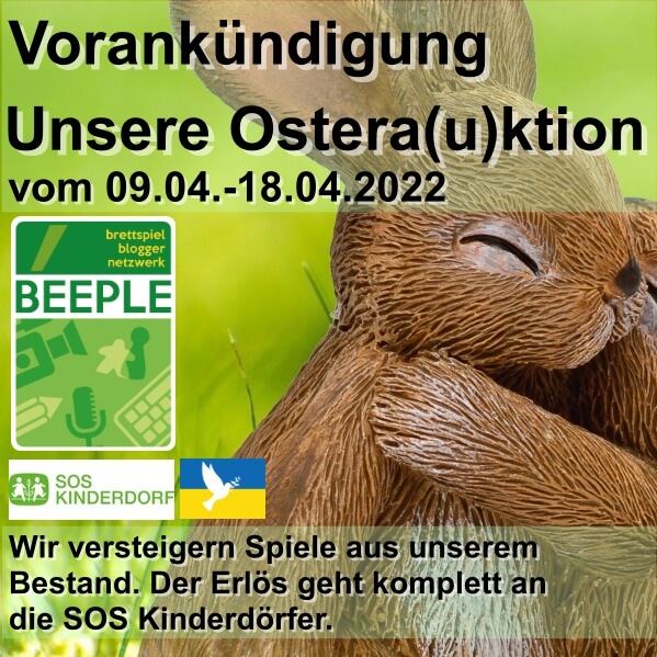 Wie schon im letzten Jahr gibt es auch 2022 wieder eine Oster-Auktion von Beeple. Wir versteigern dabei vom 9. bis zum 18. April Spiele aus unserem Fundus sowie Spendenpakete von Verlagen für einen guten Zweck, diesmal für die SOS-Kinderdörfer in der Ukraine. Den vollständigen Ankündigungstext findet Ihr hier, die Spieleliste füllen wir in den nächsten Tagen. Vielleicht habt Ihr ja die Möglichkeit, auf das eine oder andere Spiel zu bieten. Viel Spaß!