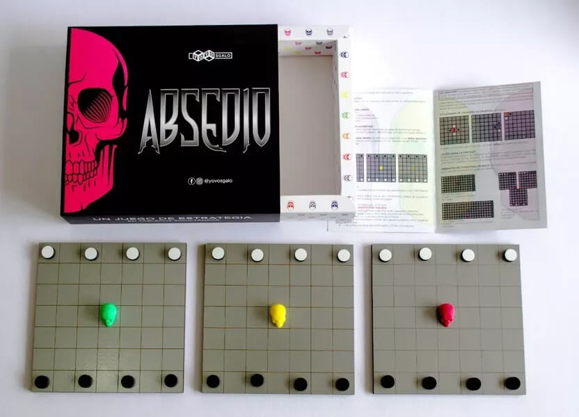 Georgina Beacon und Adrián Cassi sind das Team hinter dem Verlag Yovosgalo, von dem hier schon die Rede war. Absedio ist ein abstraktes Spiel, das auf drei Spielbrettern gleichzeitig gespielt wird. In der Mitte jedes Bretts steht eine neutrale Figur, die es einzukreisen gilt. In jedem Spielzug spielt man auf zwei Brettern, wobei man eigene Steine oder die neutrale Figur orthogonal bewegen oder einen gegnerischen Stein umdrehen und damit in die eigene Farbe verwandeln kann. Das Ziel ist es, die neutralen Figuren so zu umzingeln, dass daran mehr eigene als gegnerische Steine beteiligt sind.