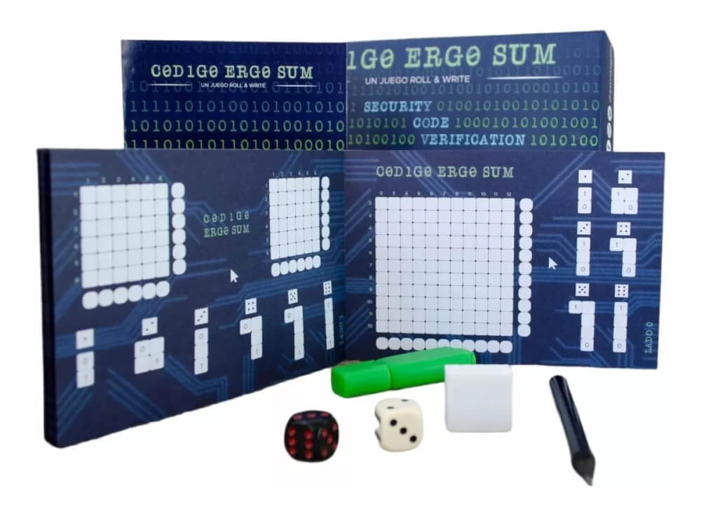 Código Ergo Sum stammt auch von Yovosgalo (siehe Absedio) und ist ein Roll and Write, bei dem es darum geht, einen Zettel mit einer bestimmten Anordnung von Nullen und Einsen zu füllen. Jede Würfelzahl ist dabei einem Polyomino zugeordnet, auf dem Nullen und Einsen stehen, die man dann entsprechend auf dem eigenen Plan richtig einsetzt.