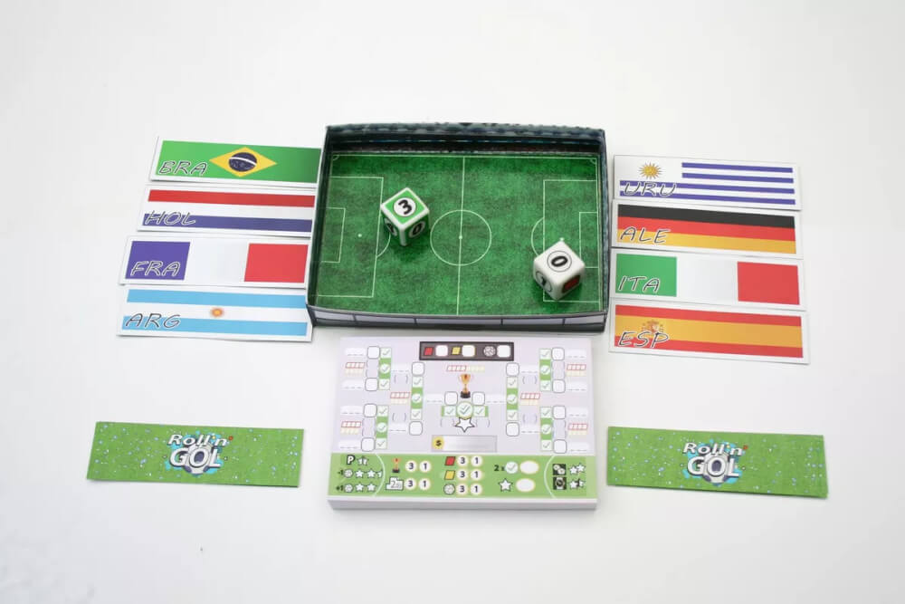 Roll‘n gol von Ariel Mora simuliert ein Fußballturnier. Vorab gibt man Tipps ab, dann würfelt man die Spiele aus, wobei man versucht, die Würfe mit Spezialfähigkeiten zu manipulieren.